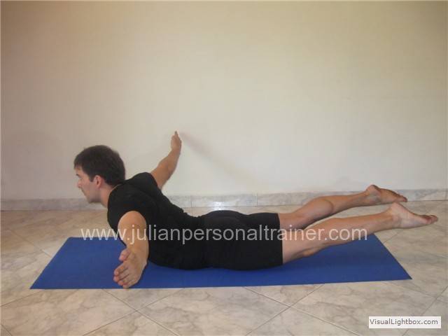 12. The swan - dive: (Ejercicio Intermedio) Acostado boca abajo, con los codos flexionados y las manos apoyadas en el Mat, el abdomen en posición neutral... ver más... |