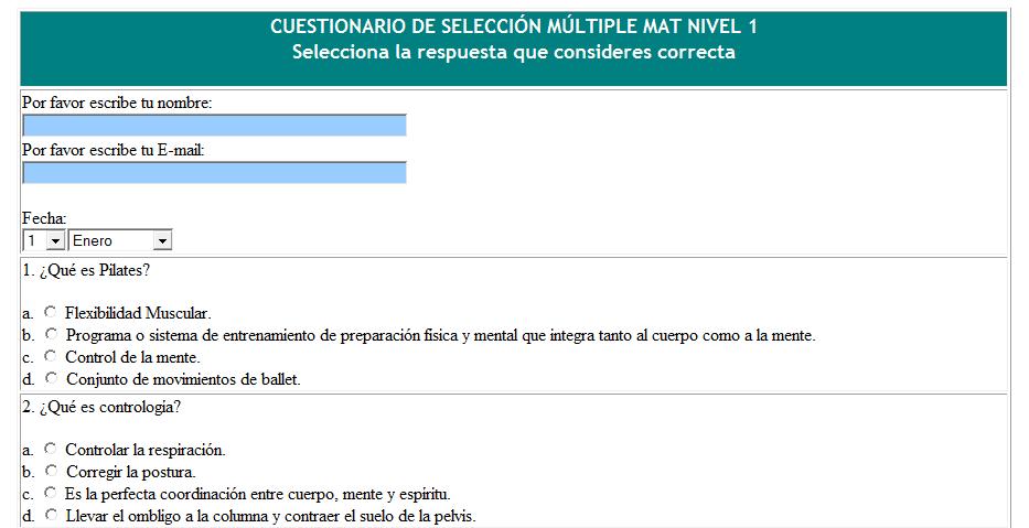 Recuerden que son 16 unidades, donde por ahora estamos repazando los conceptos teóricos, los cuales son indispensables conocer en un principio para entender el método Pilates, y sobre todo para comprender que Pilates no se trata solamente de un montón de ejercicios, sino de un proceso técnico perfectamente coordinado y con una finalidad, y sin esa técnica no podemos hablar de Pilates. Pueden además, intentar resolver el cuestionario desde ya, y probar su nivel de conocimientos, y recuerden que pueden descargar el manual de Mat en la unidad uno. Pero al finalizar el curso tomaremos nuevamente el test, y si lo aprueban se les enviará al correo su certificado de participación en el curso.